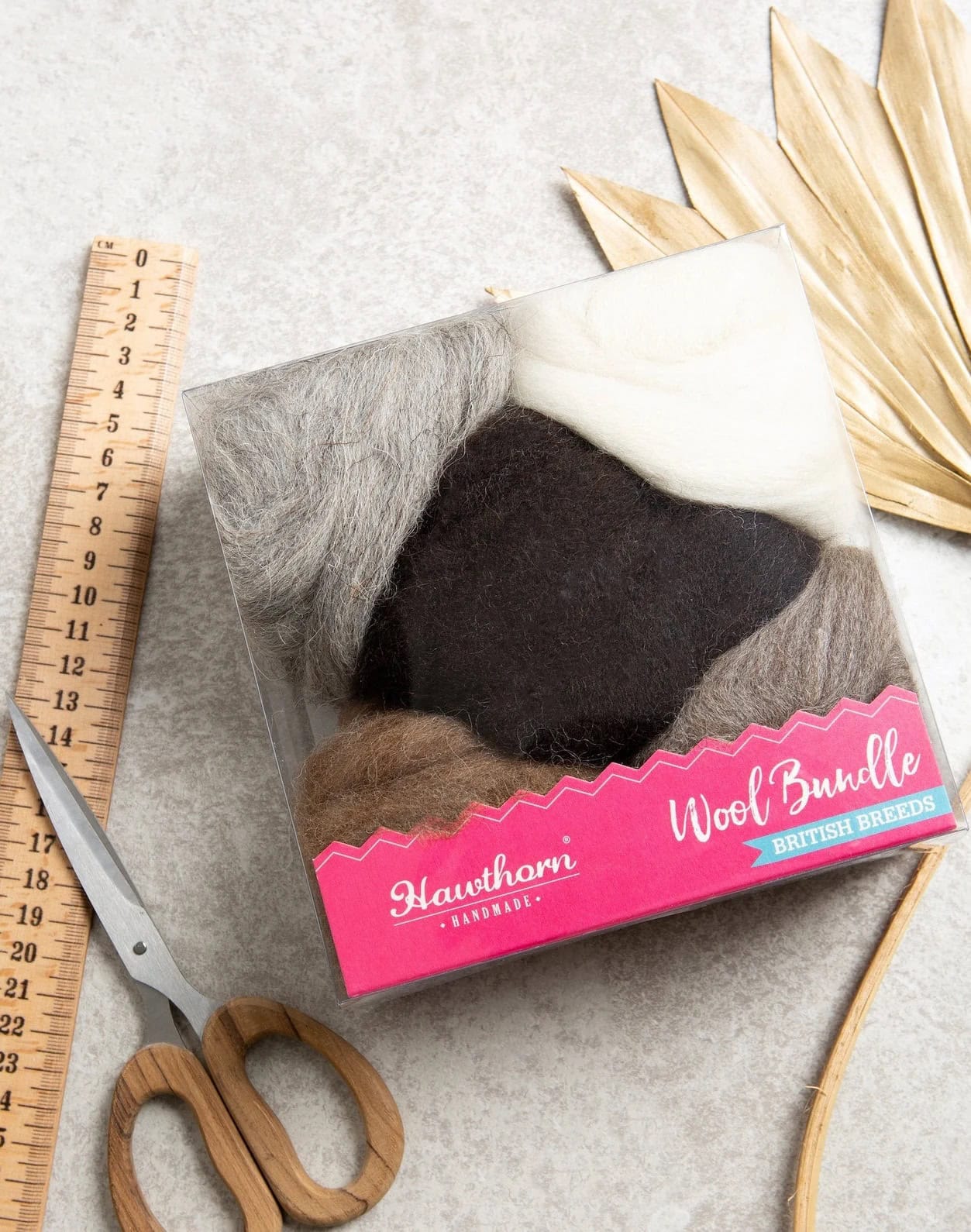 As I mentioned earlier, Hawthorne Handmade is a great resource for all things felting related. They sell a brilliant box of undyed British felting wool in 5 beautiful natural animal colours, including Manx Loaghtan (brown), Blue Faced Leicester (oatmeal),Blue Faced Leicester (white),Jacob (dark grey),Swaledale (light grey)