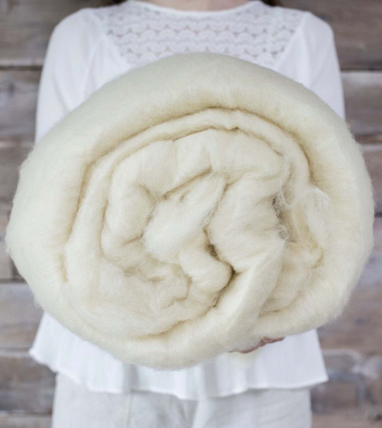 So what’s the difference between Batts and Roving? Well, batts (or batting, or fleece) and roving have both been pulled through carding machines which comb and align the fibres to some degree. But with batting, the wool comes off the machine in thin sheets which are layered to form thicker fluffy sheets.
